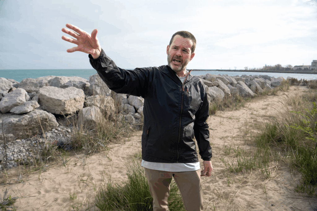 Ogden Dunes Town Council President Scott Kingan gestures while standing along the Lake Michigan shoreline in Ogden Dunes, Indiana, Tuesday, April 29, 2025. Ogden Dunes started constructing a stone revetment wall despite an ongoing legal challenge with Save the Dunes over whether the project violates the public trust.